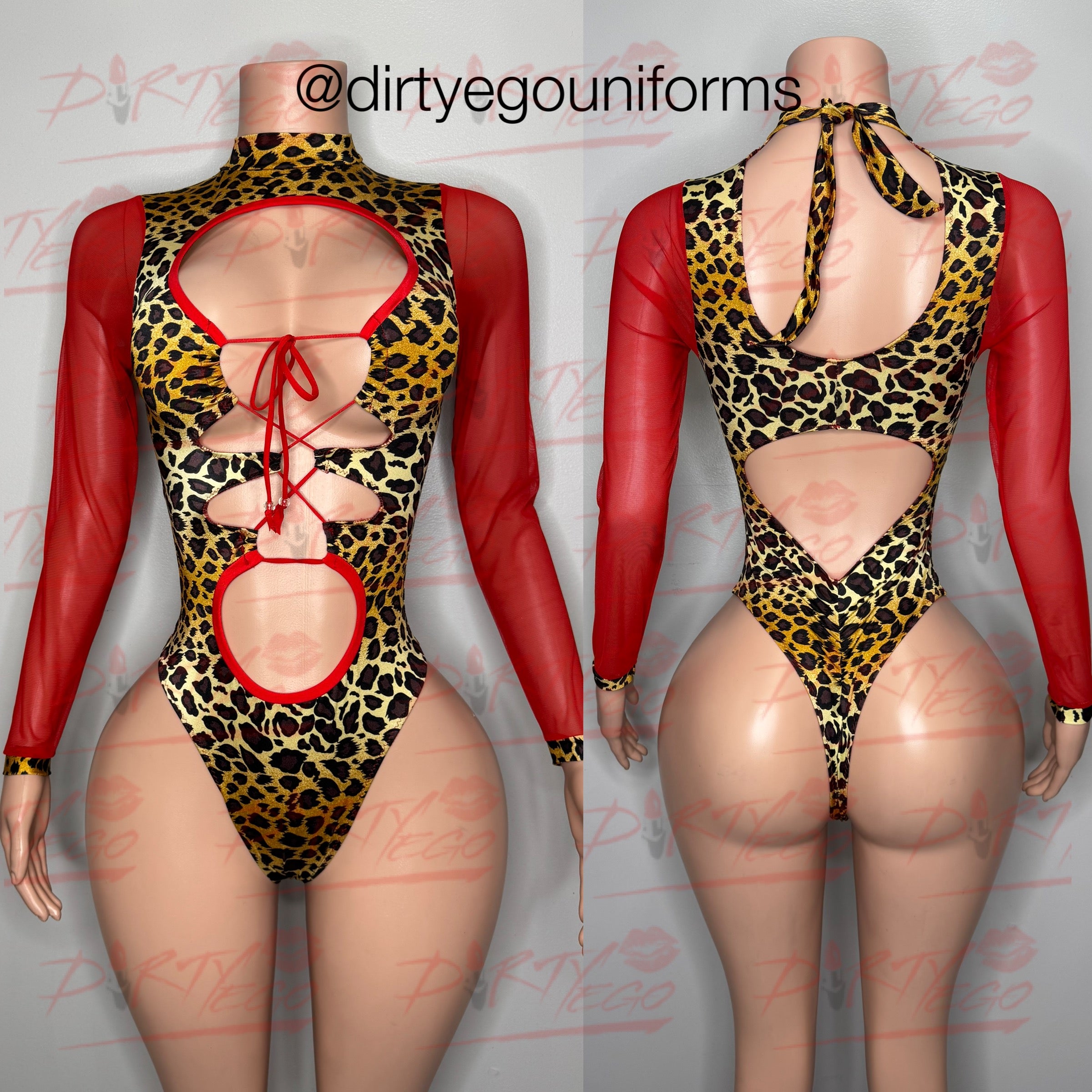 Tie neck leotard with lace up front. Scrunch butt. Mesh sleeves. Made to order. Please allow 5-7 business days for processing.