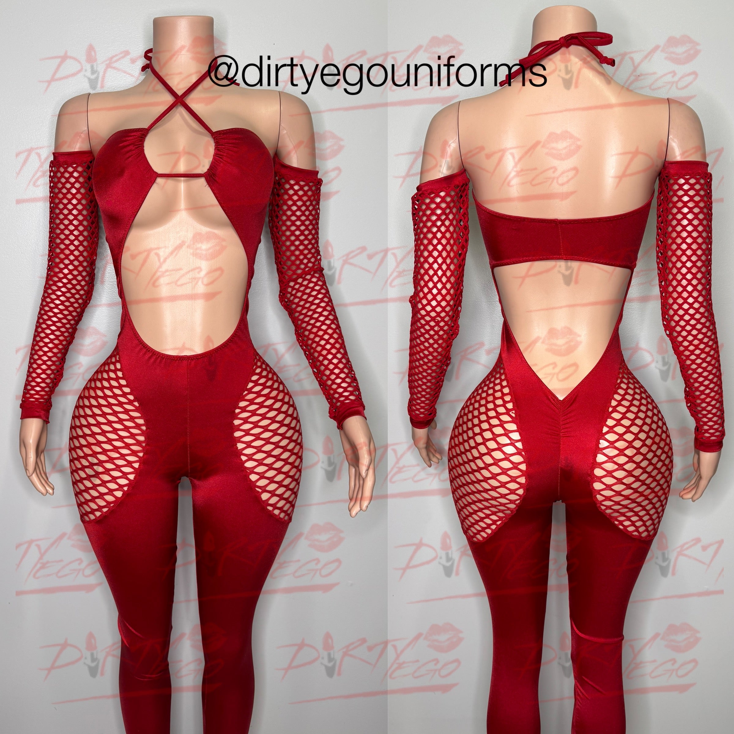 Bandeau style jumpsuit with net sleeves and hips. MADE TO ORDER. Please allow 5-7 business days for processing.