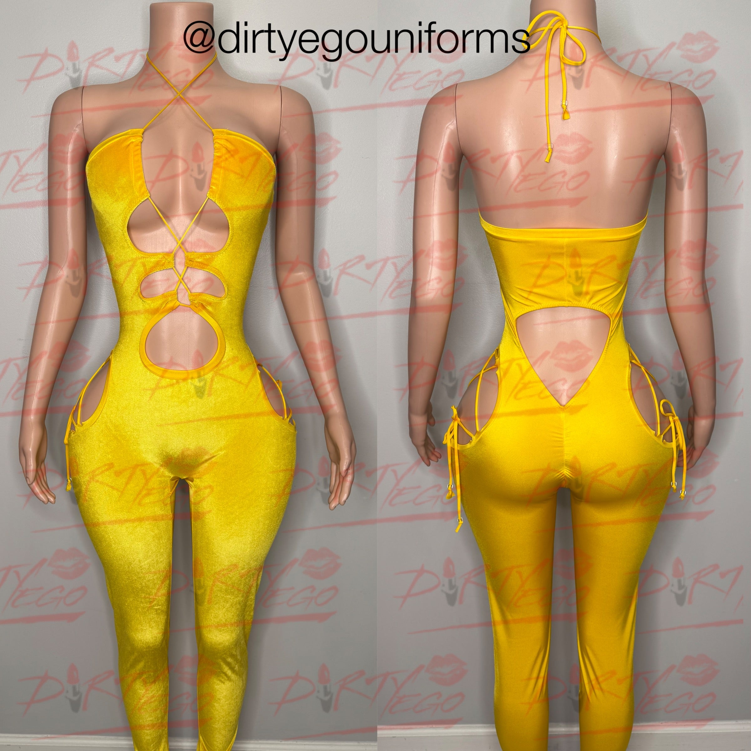 Velvet bandeau jumpsuit with hip and back cut outs.