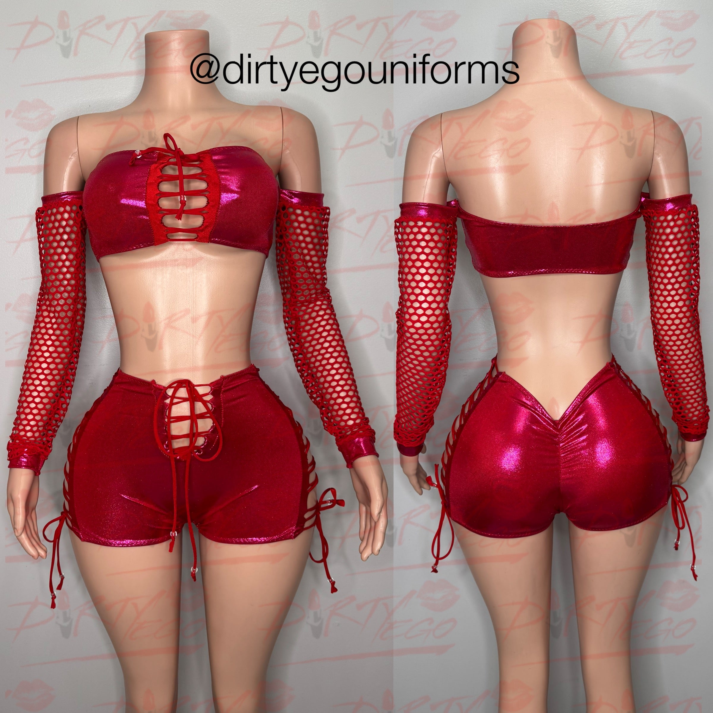Bandeau style top with attached net sleeves and lace front. Shorts are laced up in the front and sides. Made to order. Please allow 5-7 business days for processing.