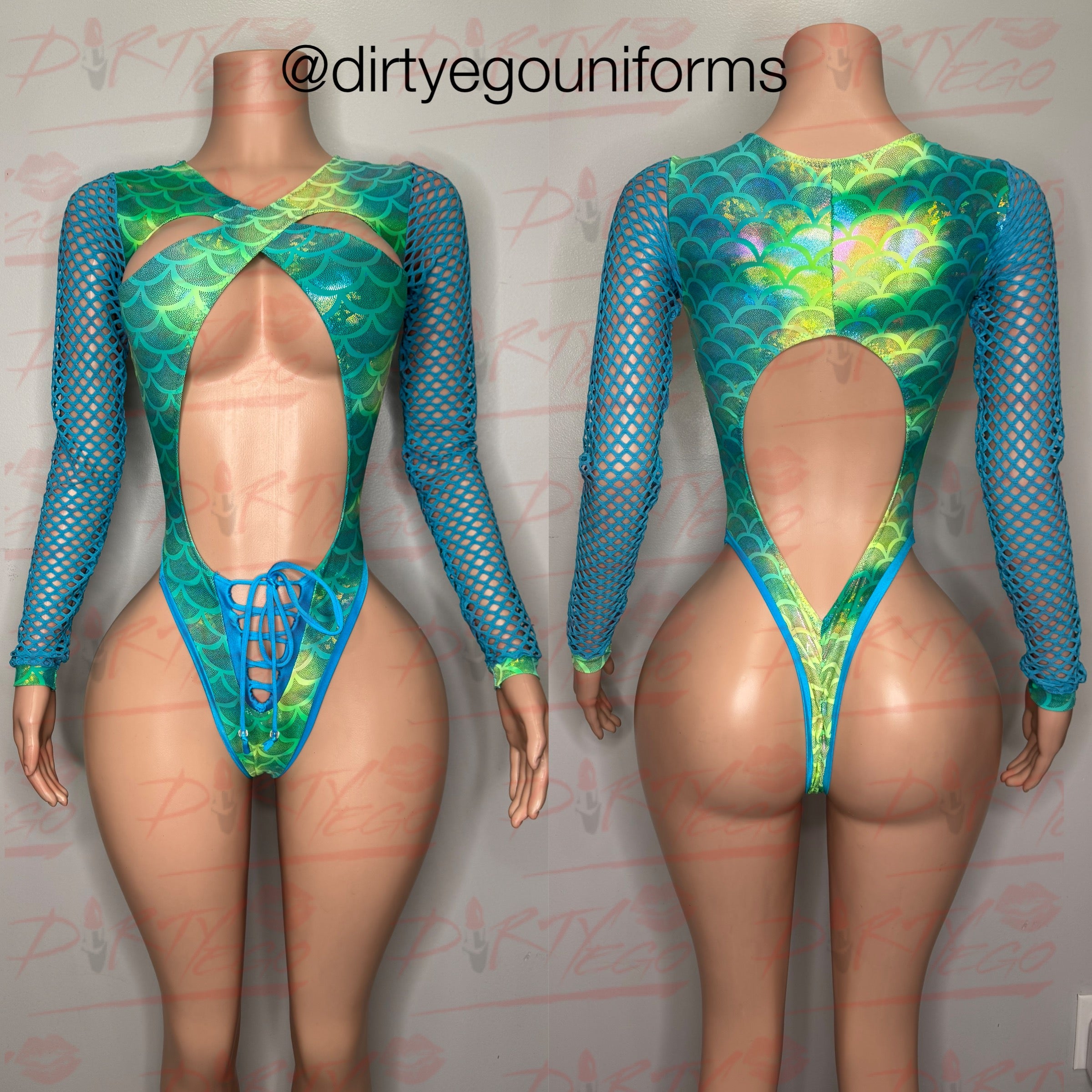 Cross top leotard with bottom lace up. Open back, scrunch butt. Net sleeves. Made to order. Please allow 5-7 days for processing.