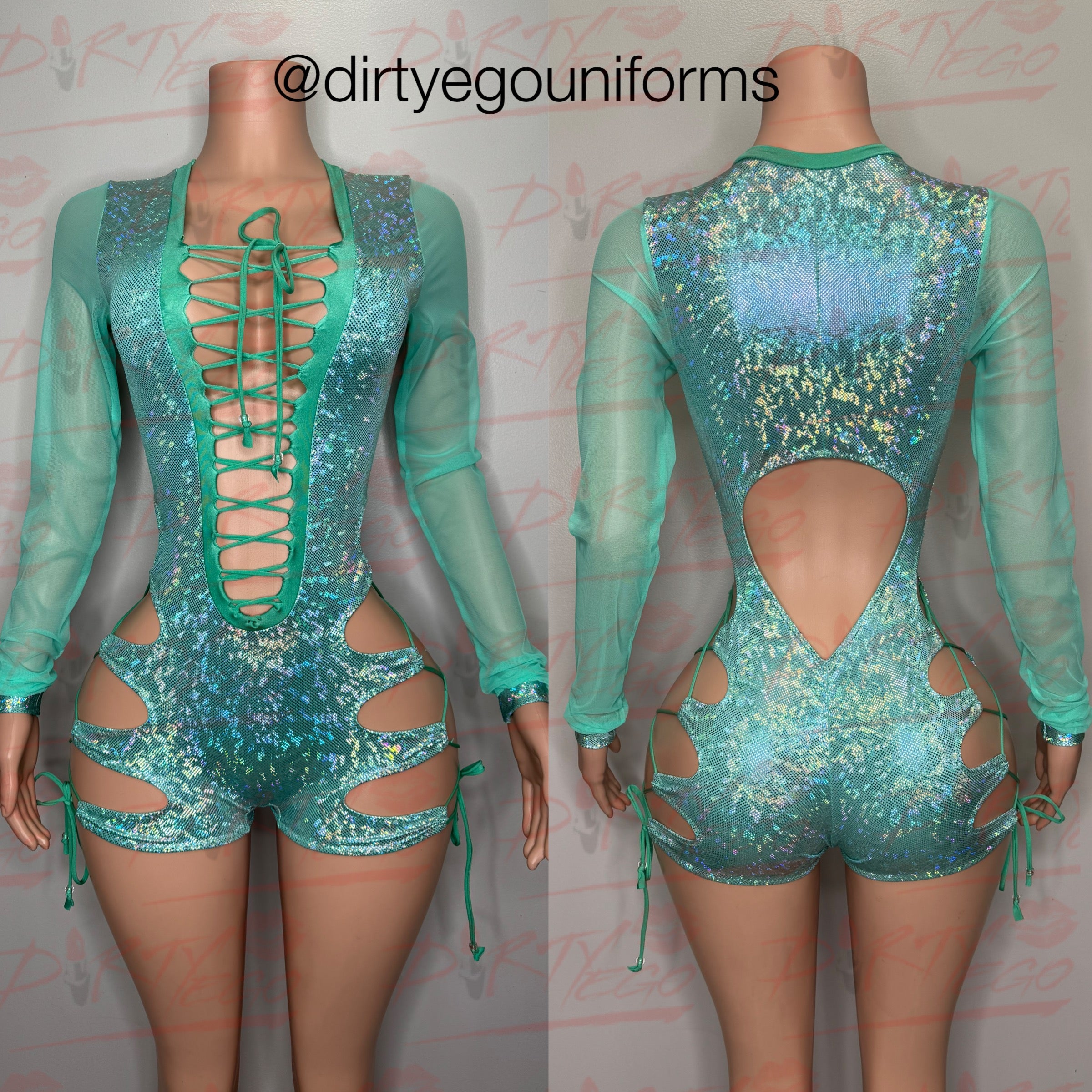Plunge romper with side hip ties. Open back. Scrunch butt. Mesh sleeves. Made to order. Please allow 5-7 days for processing.