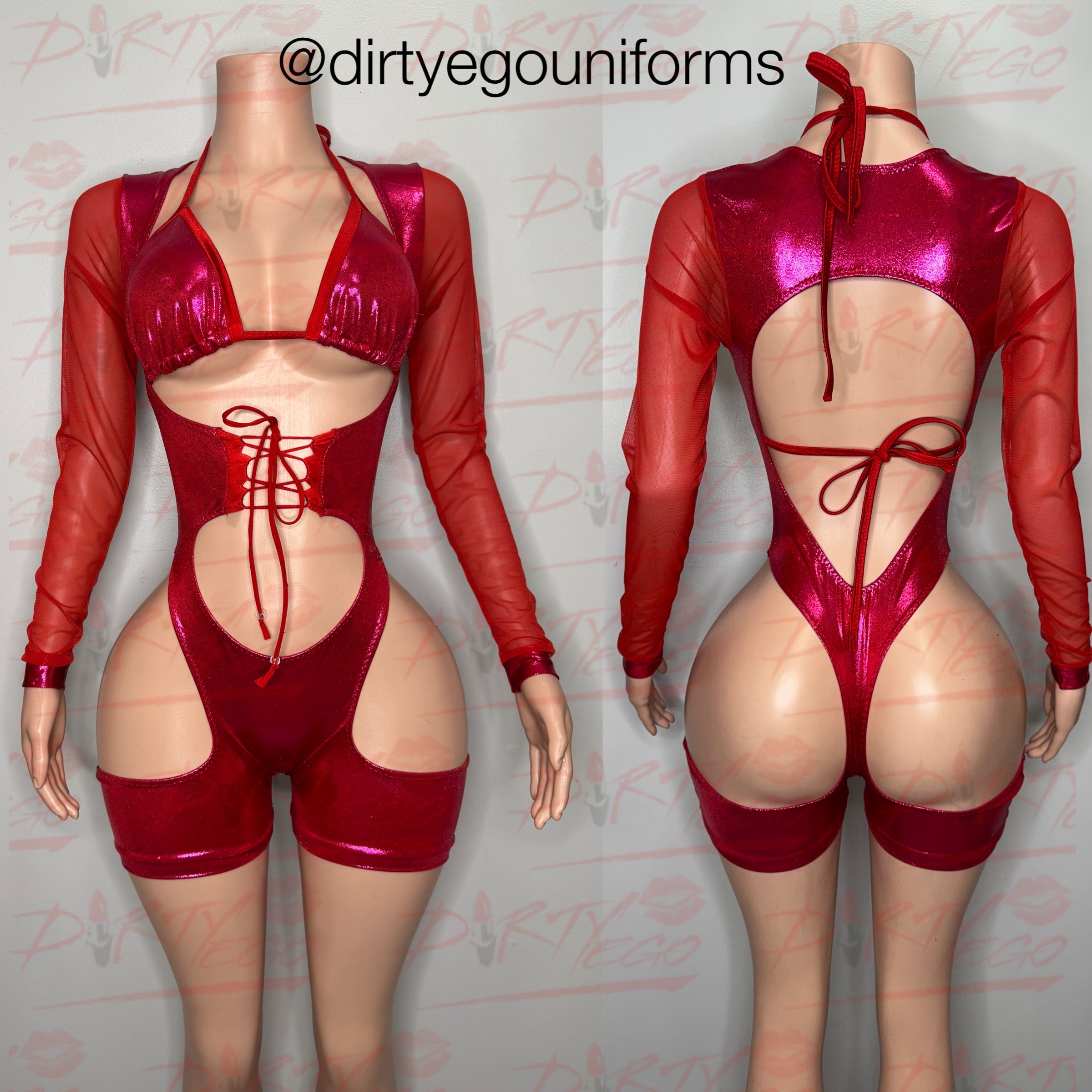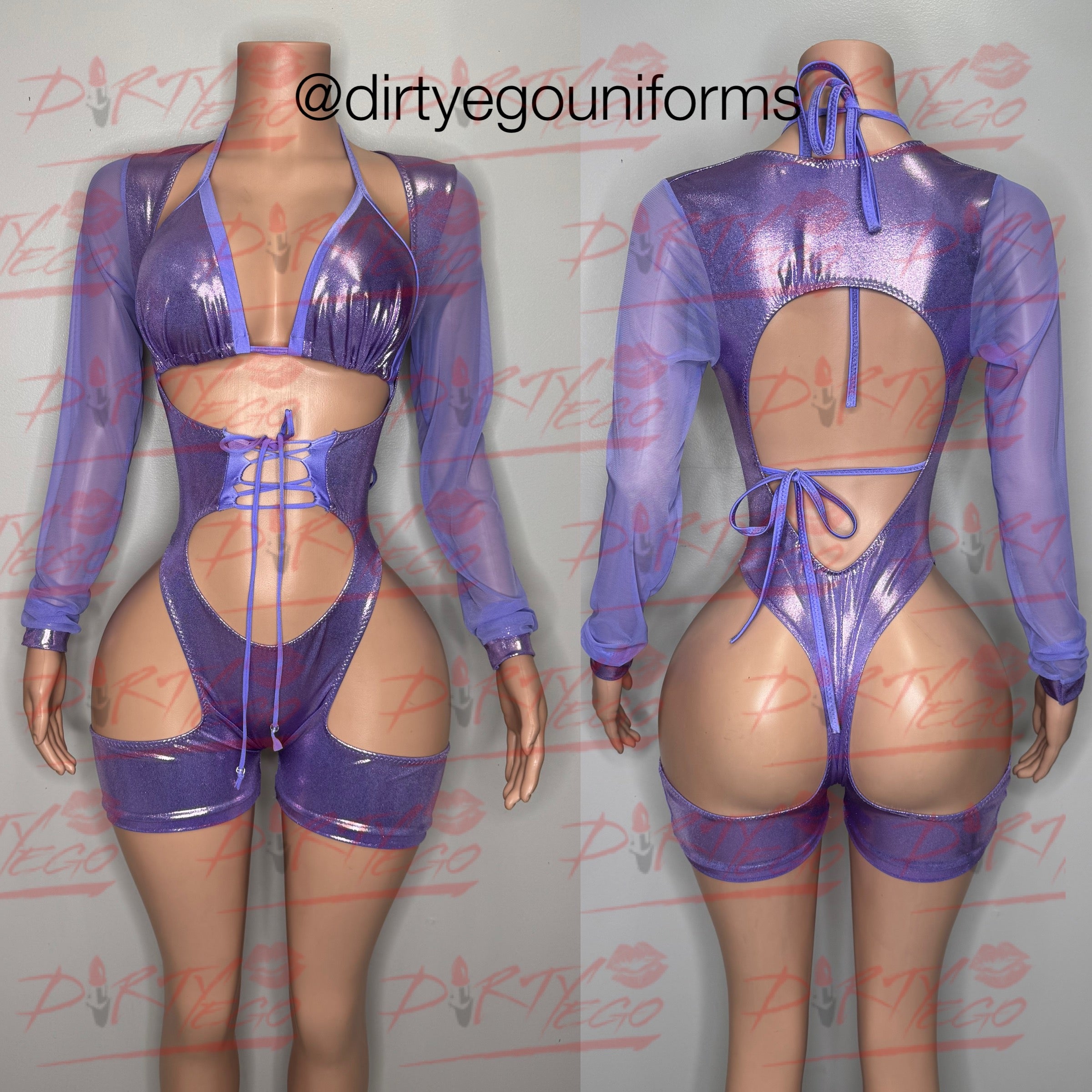 Open hip and back romper with corset tie middle. Matching bikini top. Mesh sleeves. Thong back. Made to order. Please allow 5-7 business days to process.