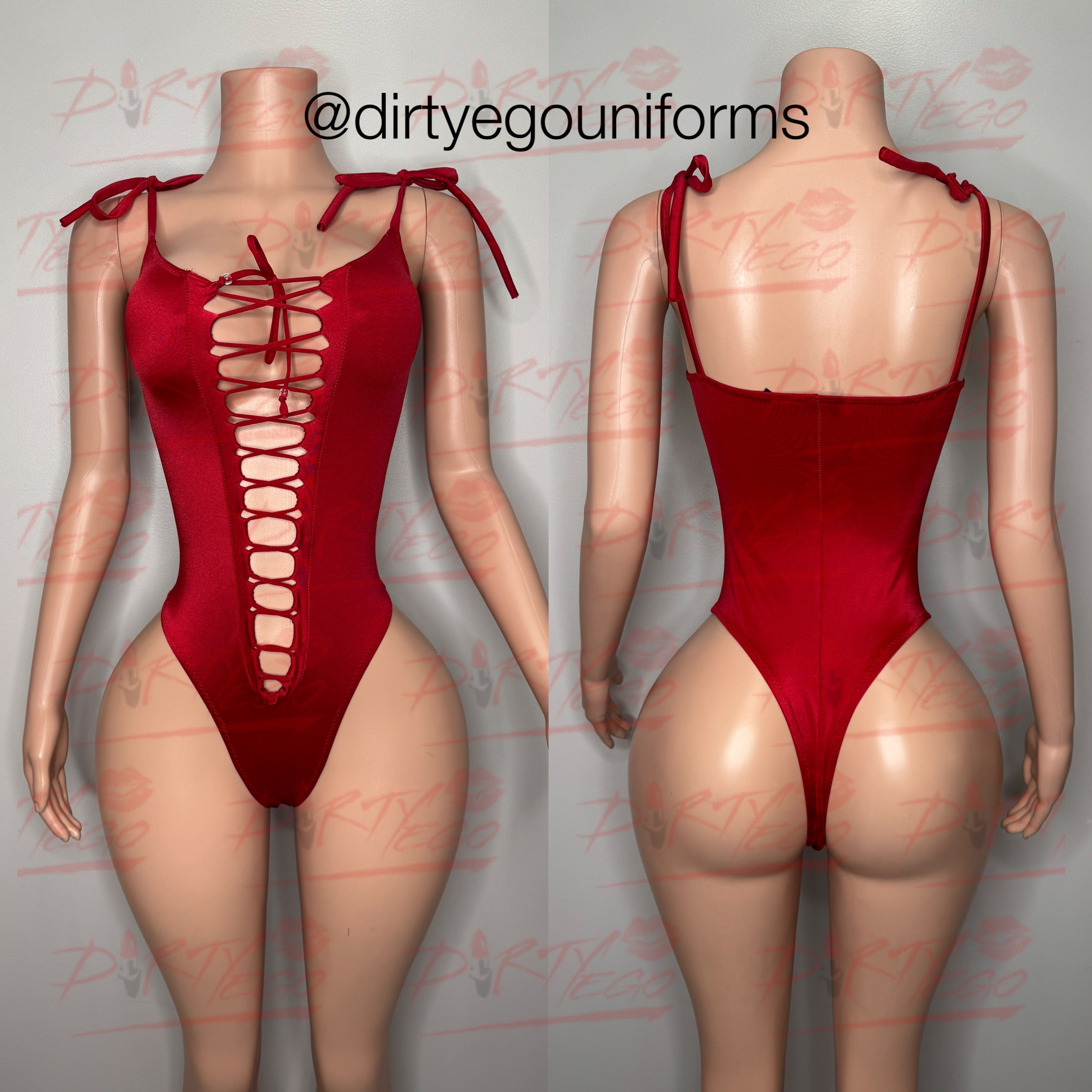Deep plunge leotard with shoulder ties. Thong back. Made to order. Fits true to size. Please allow 5-7 days for processing.